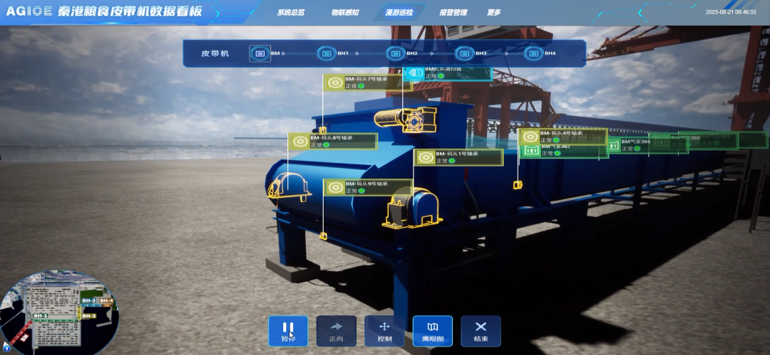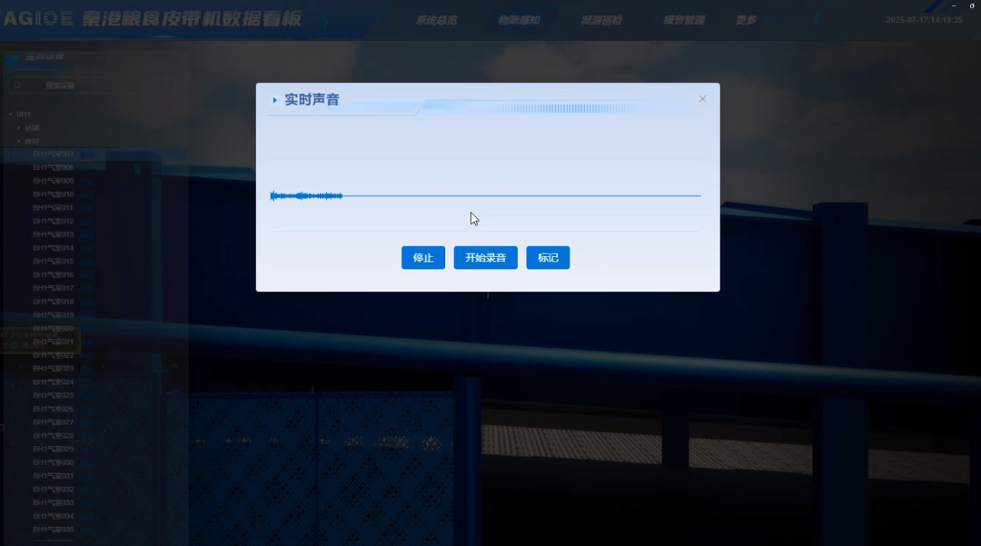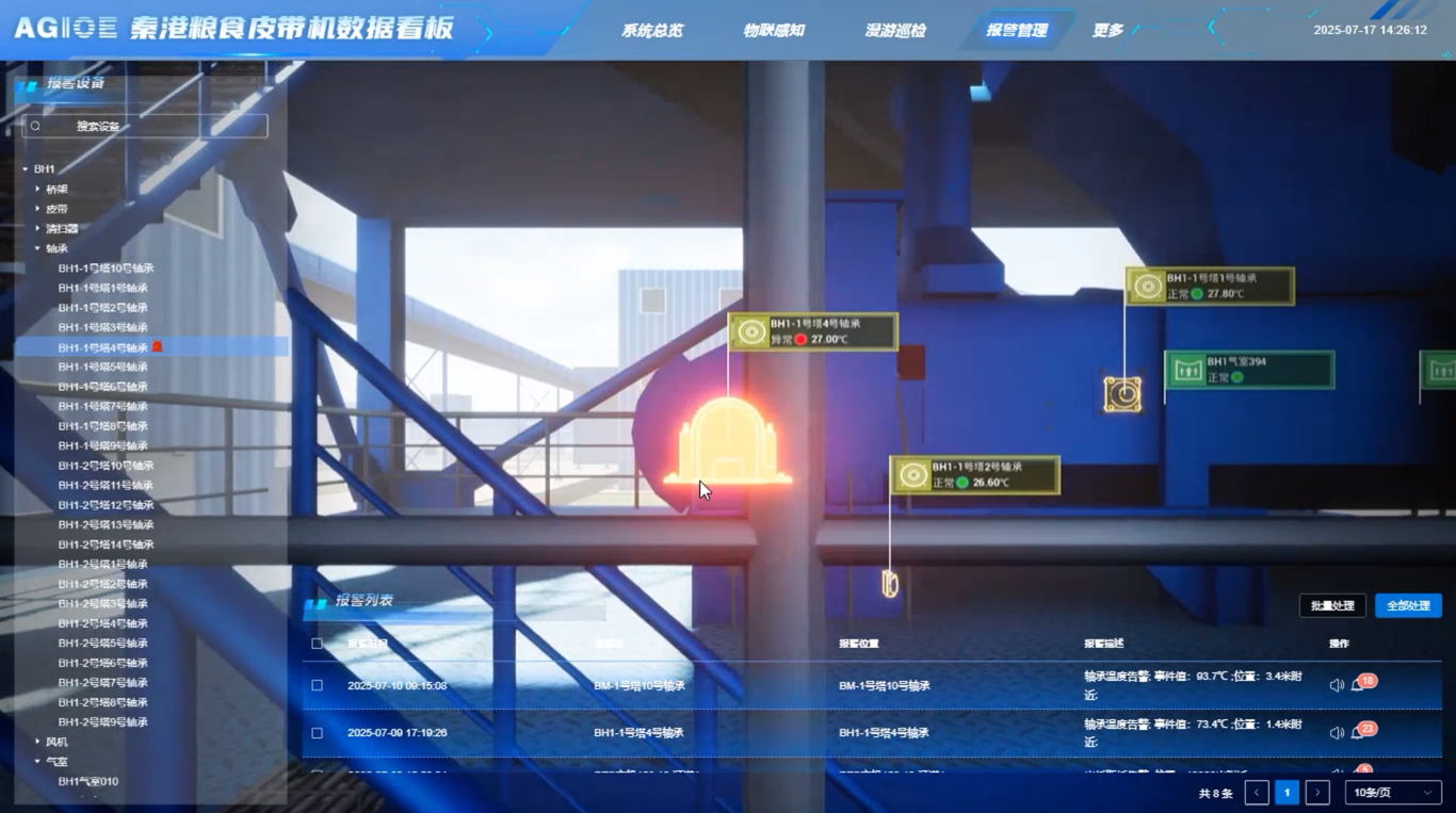 全景可視化的綜合監控系統平臺,具備全域感知及告警、風險預警三維可視、在線漫游巡檢等功能。中控員在監控室輕點鼠標,即可實現對皮帶機沿線狀況的虛擬漫游和全程可視、可聽巡檢。高清三維模型與實時數據同步呈現,溫度、振動的數值在對應坐標上逐個刷新;異常點位自動彈出告警標簽,并可在線播放實時聲音驗證。無需置身現場,便能完成一次“鷹眼式”巡檢,既節省人力,又避免高空、粉塵環境帶來的安全風險,真正實現從“人到現場”到“數在云端”的模式轉變。