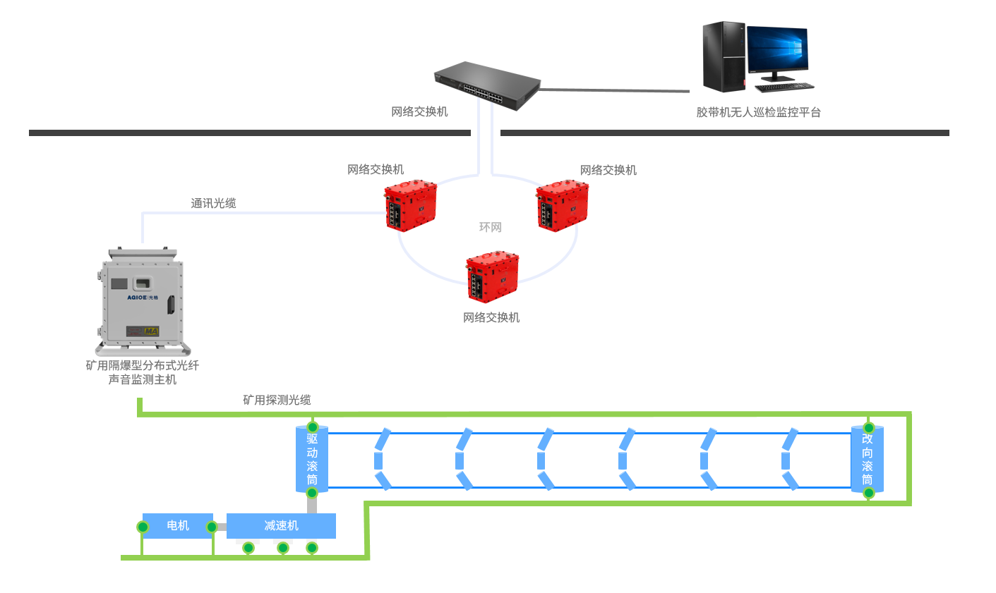 膠帶機振動監測系統以分布式光纖振動與聲學傳感技術為核心,通過在膠帶機兩側敷設探測光纜,對托輥、驅動裝置、轉接料斗等關鍵設施實現運行狀態連續感知與智能診斷,為煤礦行業無人化巡檢落地及主動安全防控體系構建提供核心技術支撐。