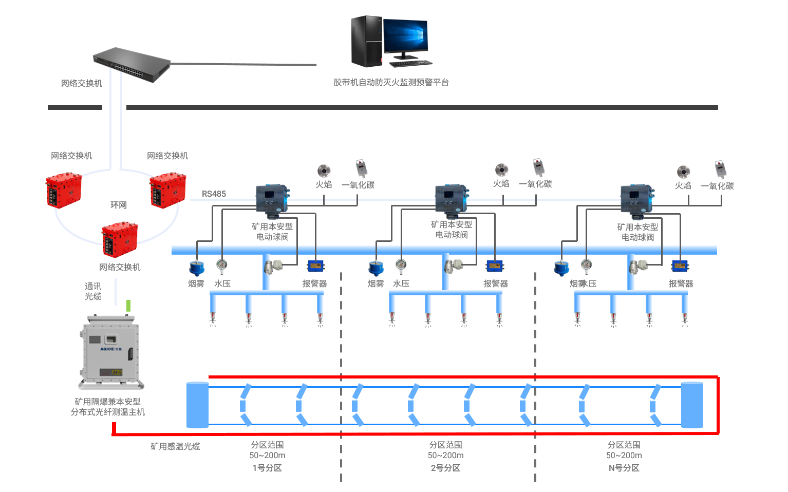 系統基于分布式光纖溫度傳感技術,在膠帶機沿線敷設感溫光纜,實現對膠帶機全線區域的連續溫度監測與實時火災隱患識別。通過融合火焰探測器、二氧化碳傳感器及煙霧傳感器等多類型感知終端,系統利用多源信息融合算法,對溫升趨勢、煙霧濃度及氣體特征進行綜合判定,從而實現火情的早期識別。